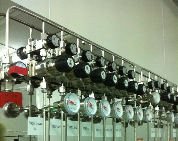 VMP:氣體閥門分配盤面,一般為SUS304鏡面或者拉絲盤面,上面裝有分配閥門管件,為終端單元,直接接入用戶設(shè)備完成氣體輸送。